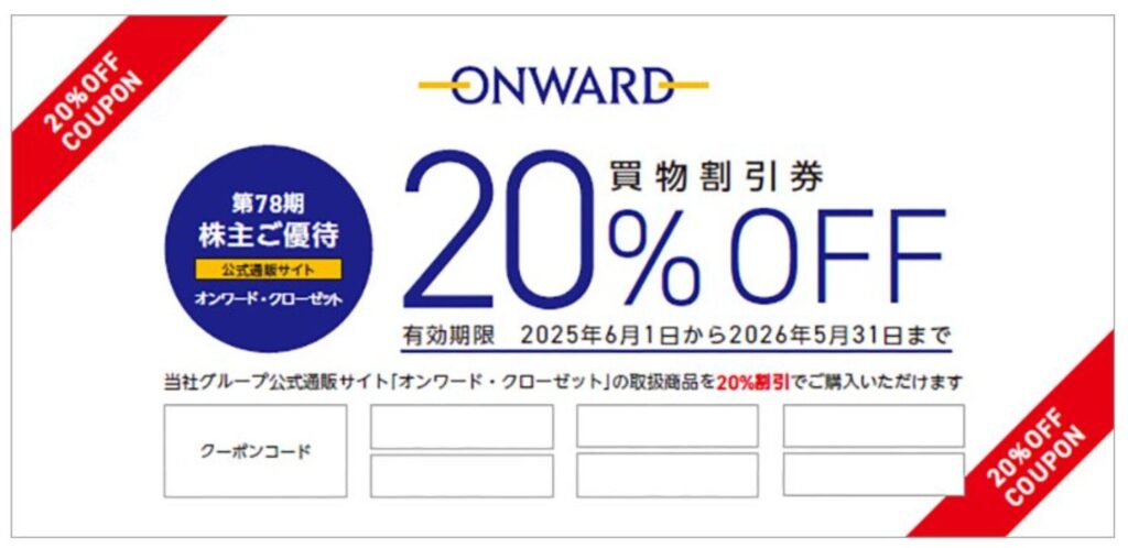 自社通販サイトで使える割引券。ただし20%オフなので、利用額に応じて実質利回りが変動する、ファッション好きに嬉しい優待。