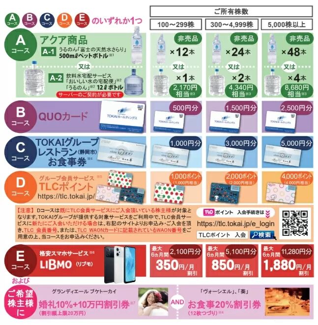 | TOKAI HD(3167) | 水宅配・QUOカードなど選択式 | 104,900 | 3.24% | 2.0% | 3月・9月 |