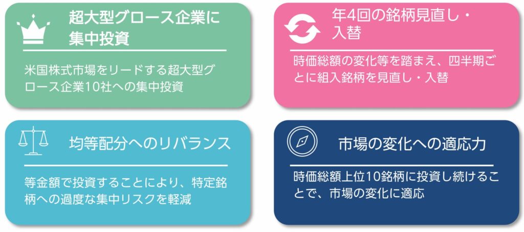 メガ10は、**成長性評価と時価総額の両面で優れた米国大型株**に均等投資する指数です。固定銘柄はなく、ヘルスケアや決済銘柄などの比較的ディフェンシブな銘柄を含むことが特徴です。