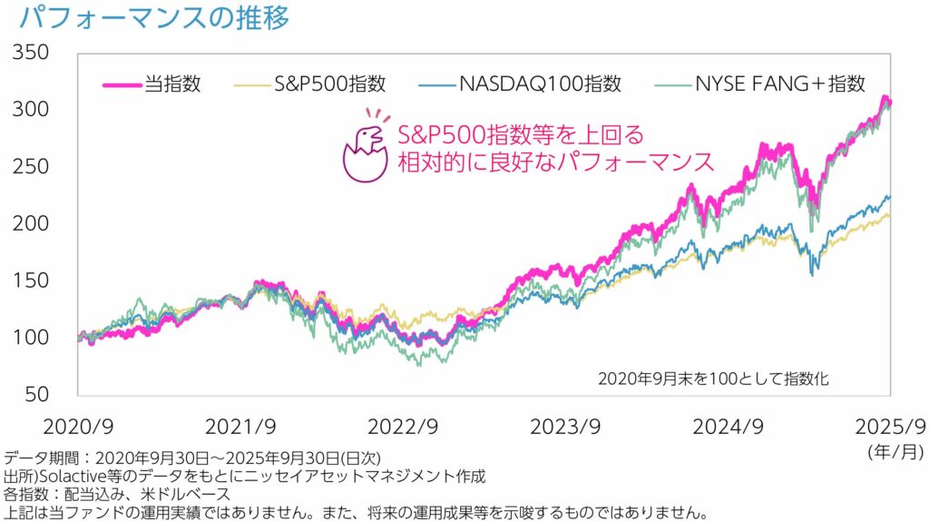 • 信託報酬は比較的低く、FANG+よりコスト面で有利
