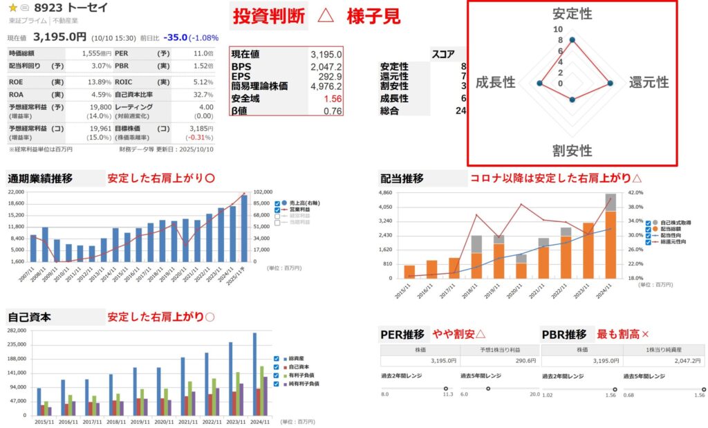 △で様子見となっていますが、安定性と還元性でポイントが高く、魅力のある銘柄です。ご興味があれば本文をご参照ください。
