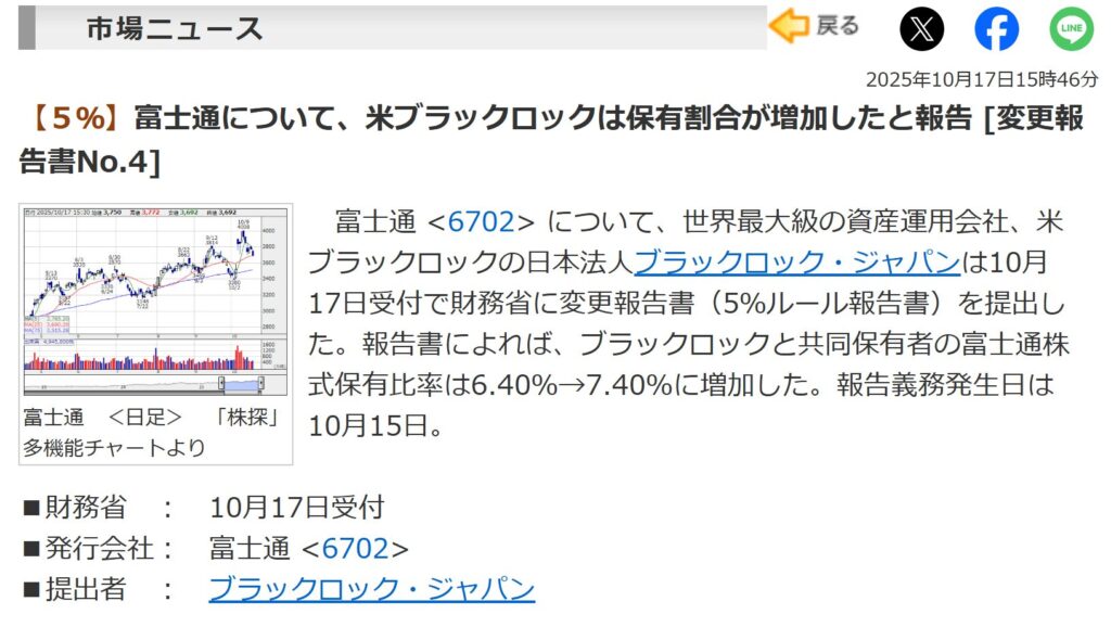 そして、この動きに注目してか米ブラックロックも富士通の保有割合を増やしてきています。6.4%から7.4%に増加で、金額にしておよそ770億円ほどの買い増しとされています。