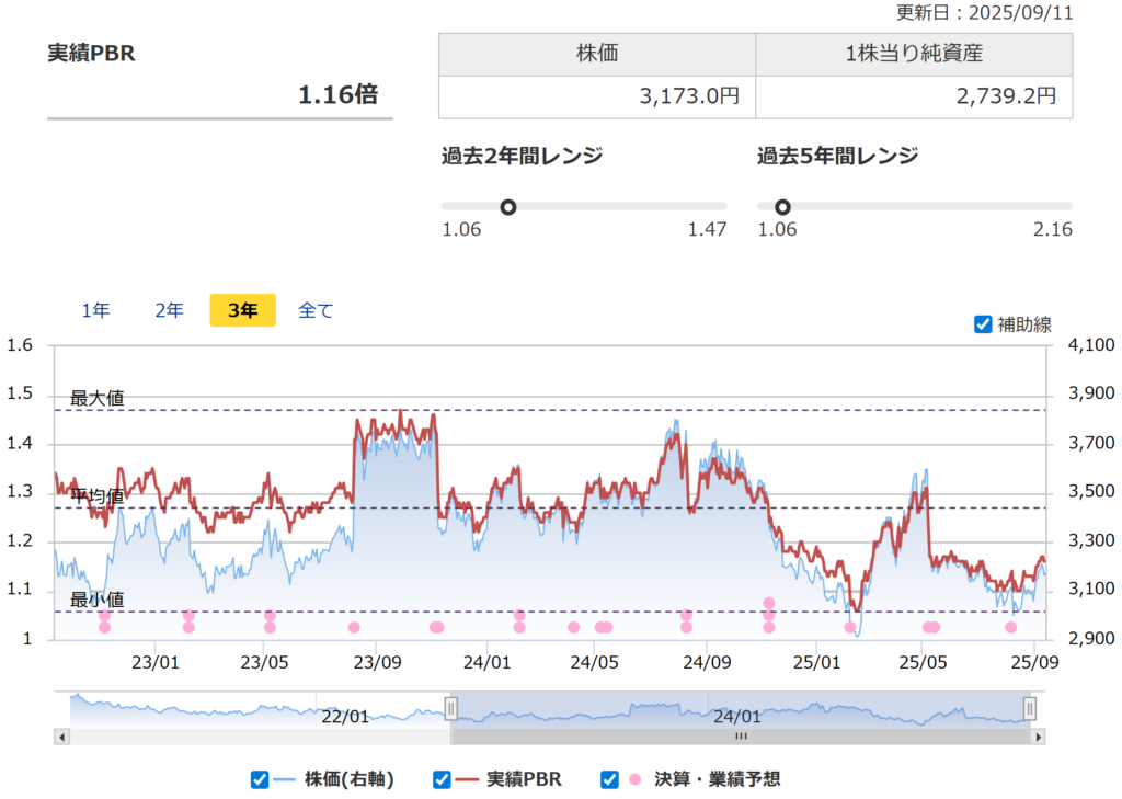 そしてPBRは1.16倍、過去5年レンジで最安付近です。超大手企業がもうすぐPBR1倍割れという水準になっています。