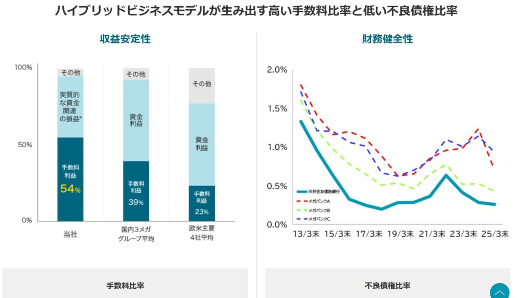 銀行と信託業務ののハイブリッドによって高い手数料比率を得られます。下の図で示されているように確かに他のメガバンクより高い手数料となっています。さらに、メガバンクと比較して不良債権比率が最も低いこともあわせて示されている点は注目に値します。