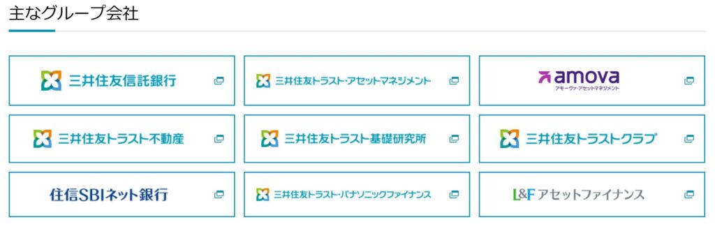 傘下には子会社(三井住友信託銀行、日興アセットマネジメント、三井住友トラスト・アセットマネジメント、日本証券代行、東京証券代行)などがあります。
