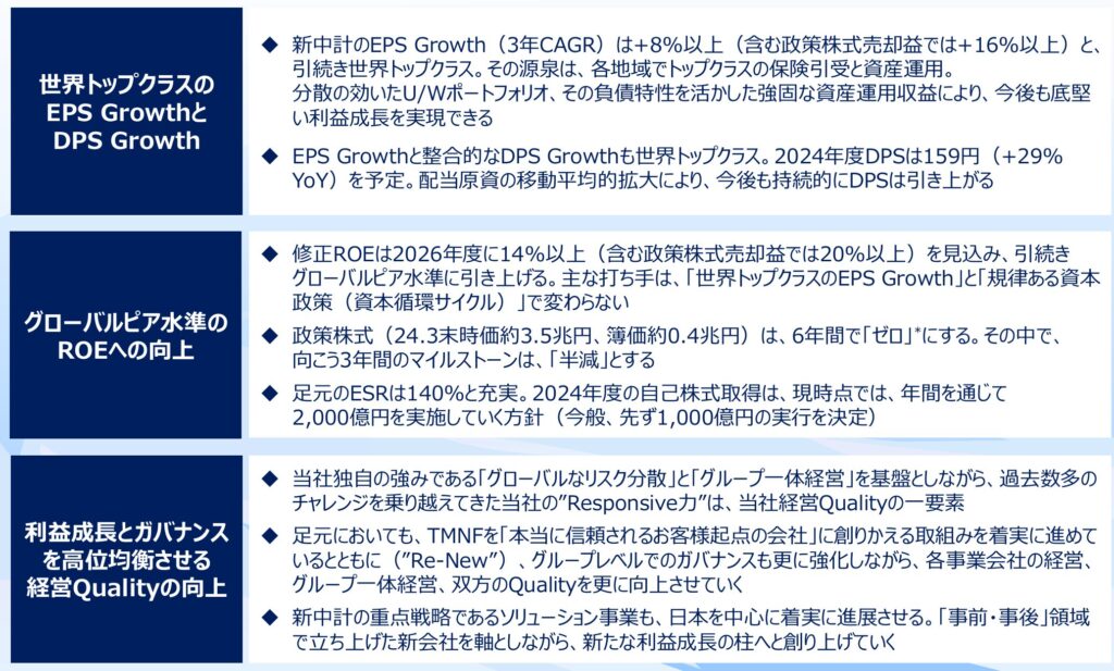 EPSの成長率は3年CAGRで8%以上となっており、継続して世界トップクラスとなっています。政策保有株の売却益を含めると16%もの数字となり、これが近年の業績好調の要因でもあります。
