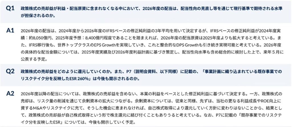 おそらくこれが警戒されて株価が下げているという側面もあると思われます。後にも述べるように政策保有株の売却益を除いた利益ベースでも増配原資はあるとの説明がなされています。この点は過度の心配は不要でしょう。